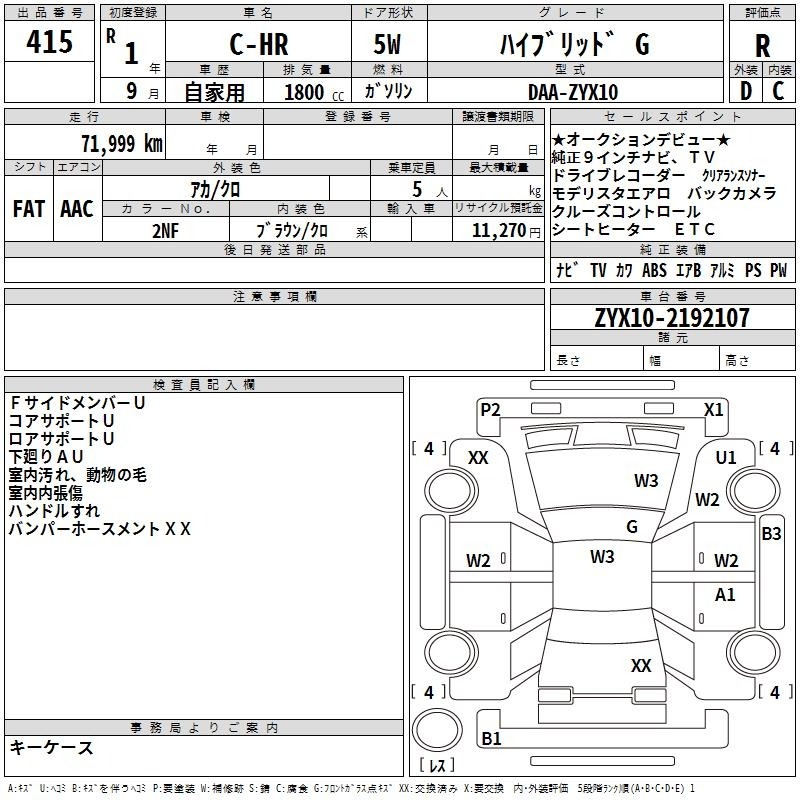 Stand out from the crowd with this sporty 2019 Toyota C-HR Hybrid G, finished in a stunning Red and Black two-tone color scheme. This unit comes equipped with the desirable Modellista Aero kit, giving it an aggressive and stylish look. Inside, enjoy premium features like a large 9-inch genuine navigation system, heated seats for comfort, and modern safety tech including clearance sonar and a drive recorder. While graded R due to previous repairs (bumper reinforcement and left fender replacement), it presents a fantastic opportunity to own a high-spec, fuel-efficient hybrid SUV at a competitive price point.
