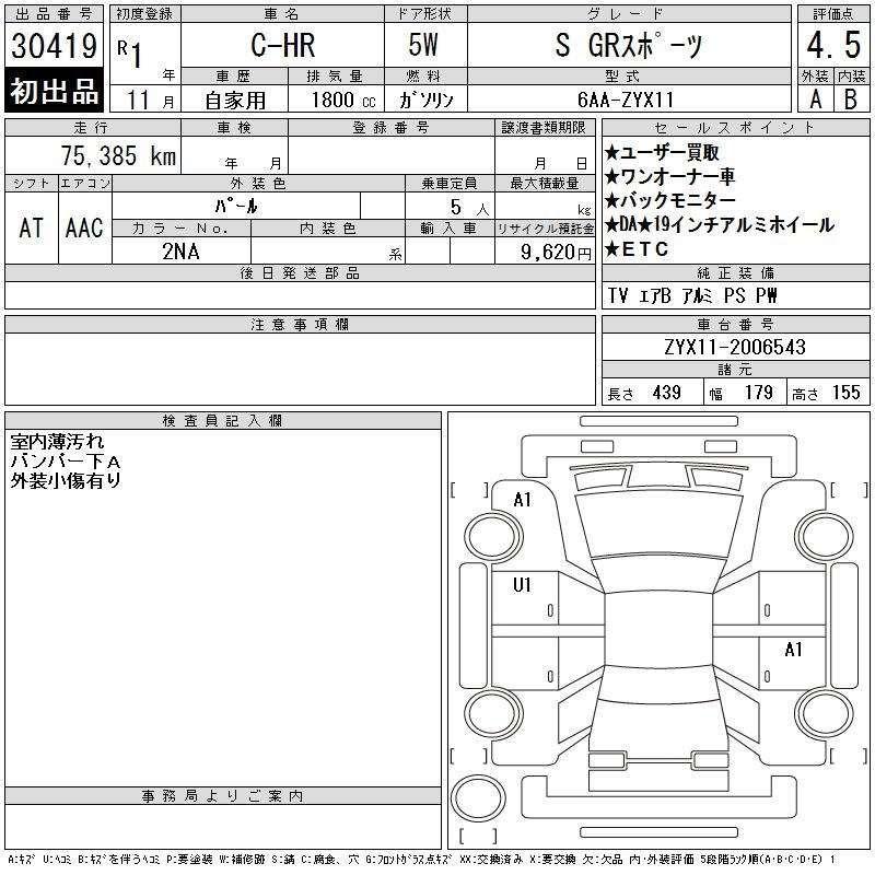 Discover this stunning 2019 Toyota C-HR in the highly desirable S GR Sport trim. Rated as a high-quality Grade 4.5 (Exterior A / Interior B) at auction, this vehicle is a ‘One Owner’ unit directly purchased from the user. It features the efficient 1.8L Hybrid engine (Chassis ZYX11) and comes equipped with sporty 19-inch alloy wheels, GR sport seats, and a back monitor. With 75,385 km on the clock and finished in a beautiful Pearl White, this sporty crossover combines Toyota’s reliability with the aggressive styling of the GR Gazoo Racing line.