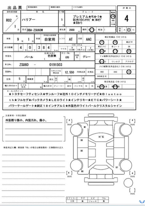Experience luxury and reliability with this 2020 Toyota Harrier Premium. This Grade 4 auction vehicle is in excellent condition with a clean Grade B interior. It comes loaded with highly desirable features including a panoramic Sunroof, Power Tailgate, and a massive aftermarket 10-inch Navigation system with Bluetooth and Full Seg TV. Safety is paramount with Toyota Safety Sense included. Finished in beautiful Pearl White Crystal Shine with genuine 18-inch alloy wheels, this low-mileage SUV (only 40,384 km) is ready for the road.
