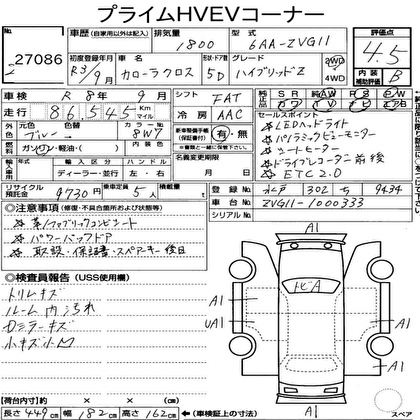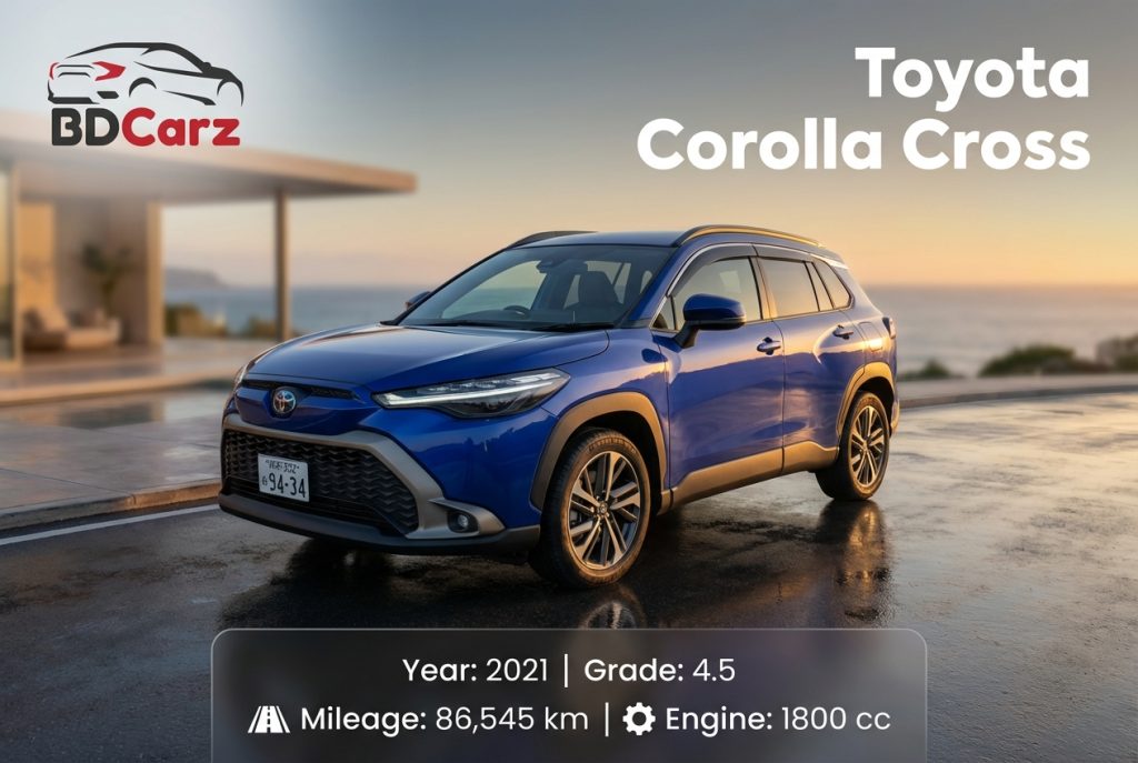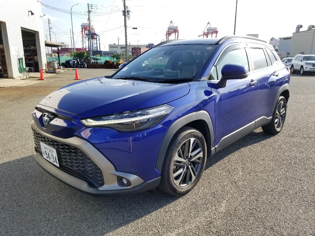 Discover this stunning 2021 Toyota Corolla Cross Hybrid Z, finished in a vibrant Blue (8W7). With a high auction grade of 4.5 and Interior B, this SUV is in excellent condition. It features a fuel-efficient 1800cc Hybrid engine and has covered 86,545 km. This top-trim model comes fully equipped with a Panoramic View Monitor, Power Back Door, Heated Seats, LED Headlights, and front/rear drive recorders. A perfect combination of modern style, safety, and hybrid efficiency.