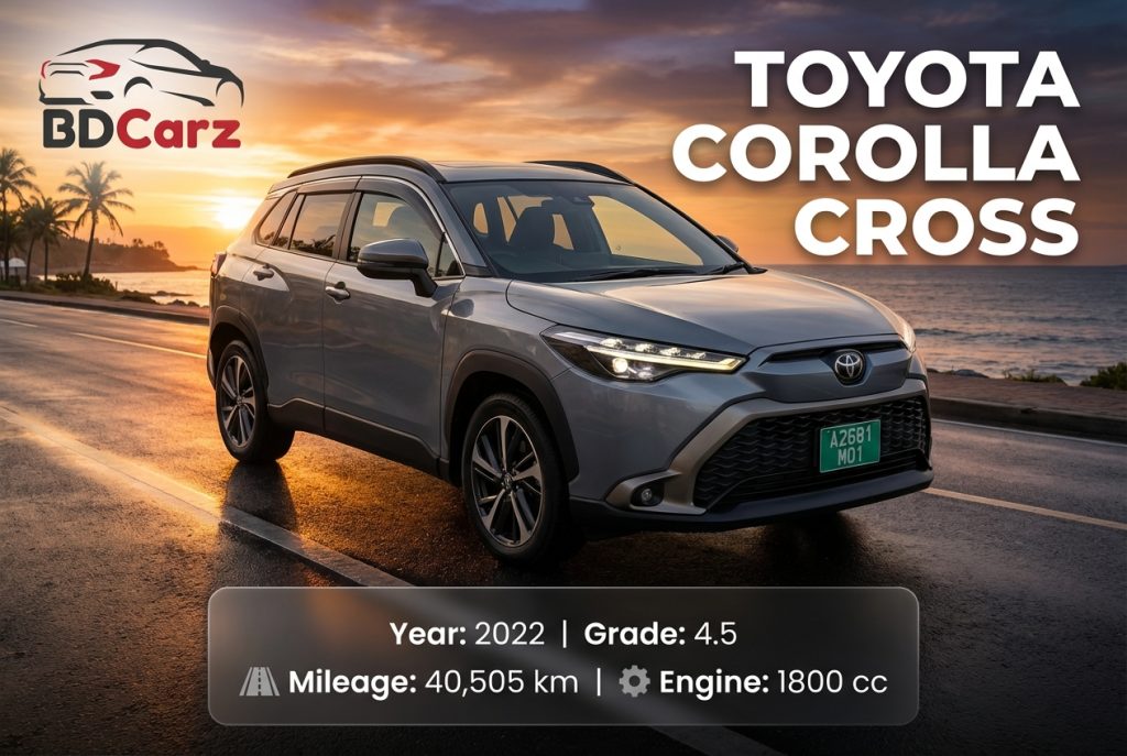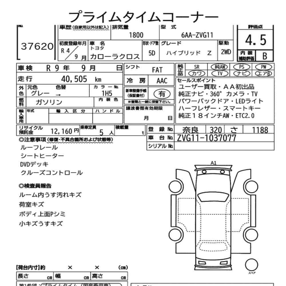 Just arrived is this excellent condition 2022 Toyota Corolla Cross Hybrid Z. Graded 4.5 at auction, this SUV features a fuel-efficient 1.8L Hybrid engine and is packed with premium factory options including a 360-degree camera, Power Back Door, and Half Leather interior. With only 40,505 km on the clock and a clean history (First time at auction/User buy), this modern SUV in Cement Gray Metallic is ready for its next owner. Features Genuine 18-inch Alloys, LED lights, and Toyota’s reliable safety tech.